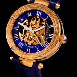 Rose Gold Plated (10 micros)stainless-steel-case. Automatic self winding Rose Gold Plated SKELETON Movement,with ball bearing Rotor.Caliber ETA 2824-2 DECOR Louis XIV,25 jewels,sweep second with stop second , water-resistant to 50m, sapphire crystal, and solid stitched alligator strap with folding Clasp. Two Year Factory Warranty Dial Sunray dark blue glossy Available Diameter 40mm only. Limited Edition.
